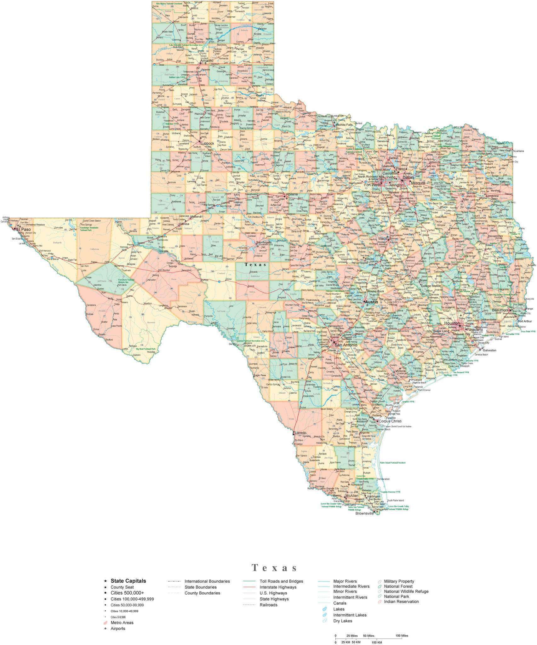 State Map of Texas in Adobe Illustrator vector format. Detailed